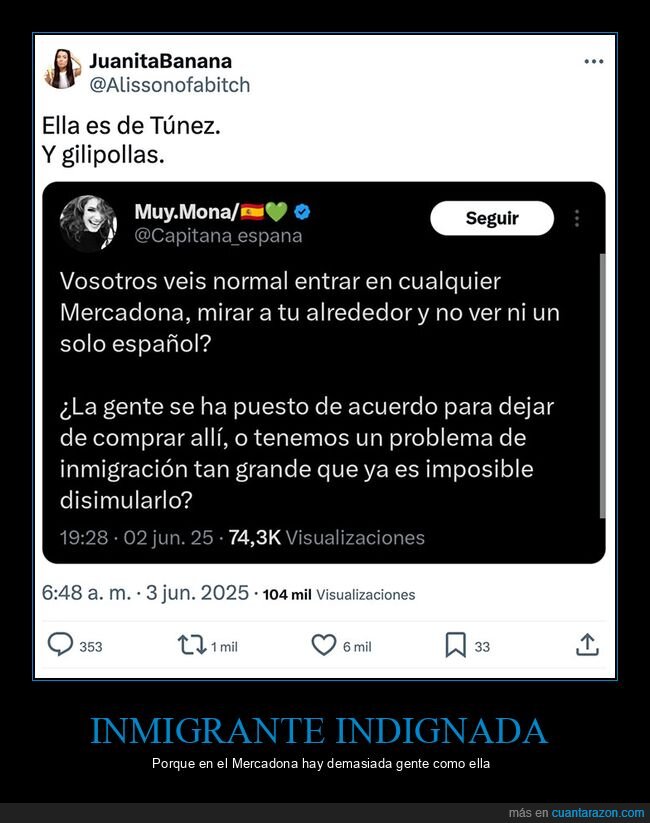 #1 #1 blankisalamera dijo: Me da igual de donde es, como si viene de Venus, lo que dice es verdad 100%, España no puede meter al 30% de marruecos en España.@blankisalamera Vamos a destrozar vidas de racistas... vamos a empezar a publicar comentarios y a ver si se hace viral y nadie te da trabajo en tu puta vida