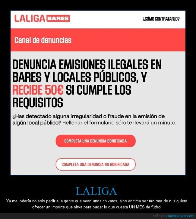 Recibir 50,00 € por denunciar a un bar que emite "en abierto" el fútbol (deporte del que todos tenemos derecho a disfrutar), o callarme, gastarme 5 euros entre un par de cañas y una tapa, y disfrutar del fútbol ahorrándome los 180 € que tengo que gastarme en Movistar por verlo.....